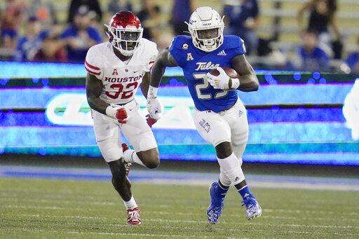 Tulsa running back Anthony Watkins (23) carries past Houston safety Gervarrius Owens (32) in the first half of an NCAA college football game Friday, Oct. 1, 2021, in Tulsa, Okla. (AP Photo/Sue Ogrocki)