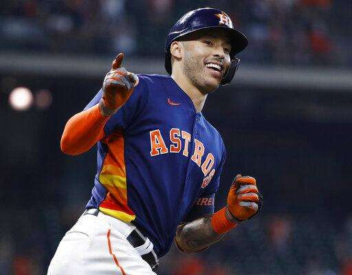 Houston Astros' Carlos Correa acknowledges the crowd after being pulled from baseball game before the ninth inning against the Oakland Athletics, Sunday, Oct. 3, 2021, in Houston. (AP Photo/Eric Christian Smith) The Associated Press