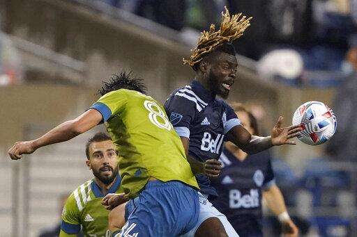 Seattle Sounders midfielder Josh Atencio, left, comes down from competing with Vancouver Whitecaps midfielder Leonard Owusu, right, for a header during the first half of an MLS soccer match Saturday, Oct. 9, 2021, in Seattle. (AP Photo/Ted S. Warren)