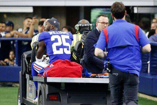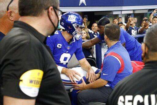 Running back Saquon Barkley sprained his left ankle early, stepping on the foot of Dallas defensive back Jourdan Lewis. Quarterback Daniel Jones sustained a concussion in a goal-line collision late in the first half. Receiver Kenny Golladay left at halftime with a knee injury, and backup cornerback Rodarius Williams tore an ACL in the second half.