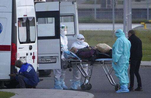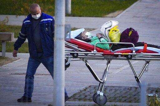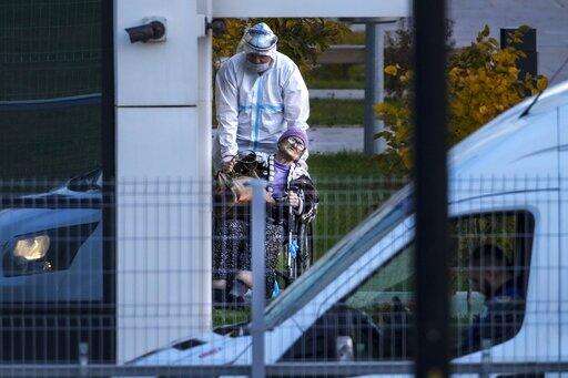 A medical worker pushes a wheelchair with a patient suspected of having coronavirus on a stretcher at a hospital in Kommunarka, outside Moscow, Russia, Monday, Oct. 11, 2021. Russia's daily coronavirus infections and deaths are hovering near all-time highs amid a laggard vaccination rate and the Kremlin's reluctance to toughen restrictions. Russia's state coronavirus task force reported 29,409 new confirmed cases Monday. That's the highest number since the start of the year and just slightly lower than the pandemic record reached in December. (AP Photo/Alexander Zemlianichenko)