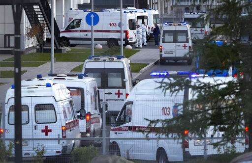 Ambulances with patients suspected of having coronavirus stand near a hospital in Kommunarka, outside Moscow, Russia, Monday, Oct. 11, 2021. Russia's daily coronavirus infections and deaths are hovering near all-time highs amid a laggard vaccination rate and the Kremlin's reluctance to toughen restrictions. Russia's state coronavirus task force reported 29,409 new confirmed cases Monday. That's the highest number since the start of the year and just slightly lower than the pandemic record reached in December. (AP Photo/Alexander Zemlianichenko)