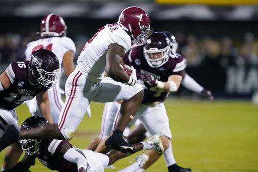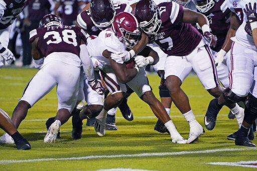 Mississippi State defenders gang tackle Alabama running back Brian Robinson Jr. (4) during the first half of an NCAA college football game in Starkville, Miss., Saturday, Oct. 16, 2021. (AP Photo/Rogelio V. Solis)