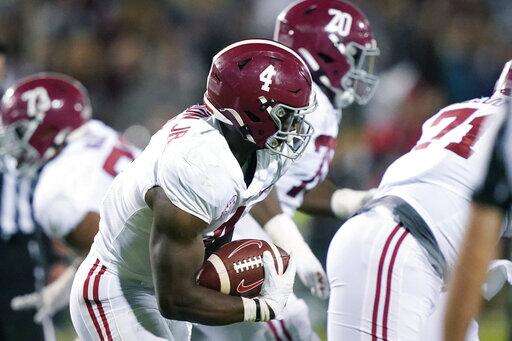 Alabama running back Brian Robinson Jr. (4) runs upfield against Mississippi State during the first half of an NCAA college football game in Starkville, Miss., Saturday, Oct. 16, 2021. (AP Photo/Rogelio V. Solis)