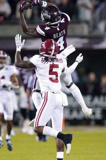 Mississippi State wide receiver Malik Heath (4) pulls in a pass reception for short yardage in front of Alabama defensive back Jalyn Armour-Davis (5) during the first half of an NCAA college football game in Starkville, Miss., Saturday, Oct. 16, 2021. (AP Photo/Rogelio V. Solis)