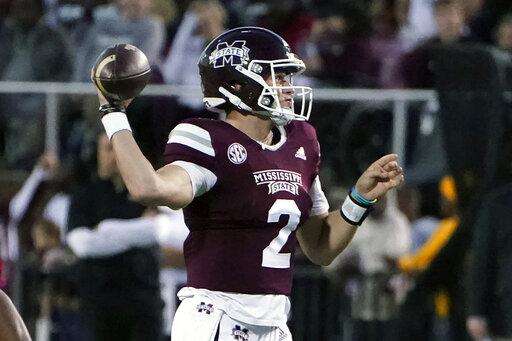Mississippi State quarterback Will Rogers (2) passes against Alabama during the first half of an NCAA college football game in Starkville, Miss., Saturday, Oct. 16, 2021. (AP Photo/Rogelio V. Solis)
