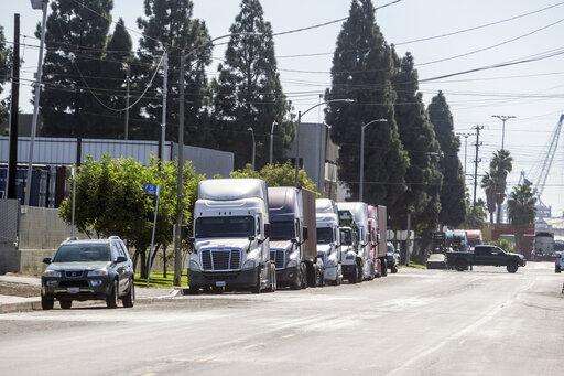 Cargo container trucks wait in line to enter AMP Terminals at the Port of Los Angeles, Wednesday, Oct. 20, 2021 in San Pedro, Calif. California Gov. Gavin Newsom on Wednesday issued an order that aims to ease bottlenecks at the ports of Los Angeles and Long Beach that have spilled over into neighborhoods where cargo trucks are clogging residential streets. (AP Photo/Ringo H.W. Chiu) The Associated Press
