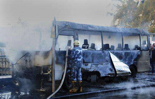 The explosions in Damascus, which also left several wounded, happened at a busy intersection near a main bus transfer point where commuters and schoolchildren typically converge. After the blasts, Syrian state TV showed footage of smoke rising from a charred bus as soldiers hosed down the vehicle and onlookers flocked to a nearby bridge to watch.