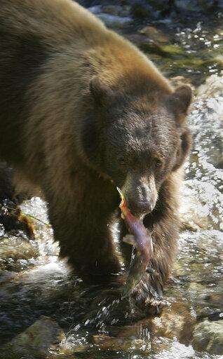 FILE - In this Wednesday, Oct. 8, 2008 file photo, a black bear comes up with a kokanee salmon while hunting for fish along Taylor Creek near South Lake Tahoe, Calif. Drought fueled by climate change has dropped Lake Tahoe below its natural rim and halted flows into the Truckee River, an historically cyclical event that's occurring sooner and more often than it used to raising fears about what might be in store for the famed alpine lake. Scientists are concerned that the growing frequency of low-water extremes may become the new normal, Friday, Oct. 22, 2021 (AP Photo/Rich Pedroncelli, File) The Associated Press
