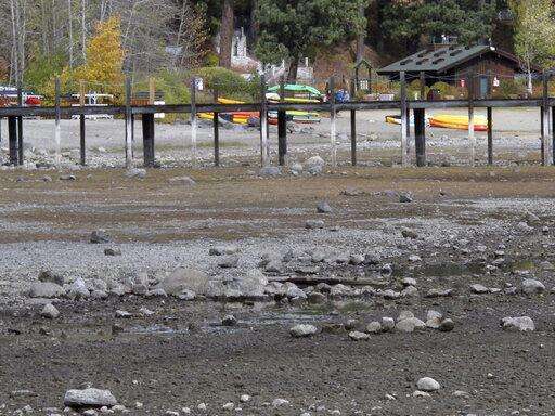 A pier and dock sits above Lake Tahoe's receding shoreline Wednesday, Oct. 20, 2021 at Tahoe City, Calif. Drought fueled by climate change has dropped Lake Tahoe below its natural rim and halted flows into the Truckee River, an historically cyclical event that's occurring sooner and more often than it used to raising fears about what might be in store for the famed alpine lake. (AP Photo/Scott Sonner). The Associated Press