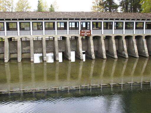 The gates are open at the dam on Lake Tahoe but no water is flowing into the mouth of the Truckee River Wednesday, Oct. 20, 2021 in Tahoe City, Calif. Drought fueled by climate change has dropped Lake Tahoe below its natural rim and halted flows into the Truckee River, an historically cyclical event that's occurring sooner and more often than it used to _ raising fears about what might be in store for the famed alpine lake. (AP Photo/Scott Sonner). The Associated Press