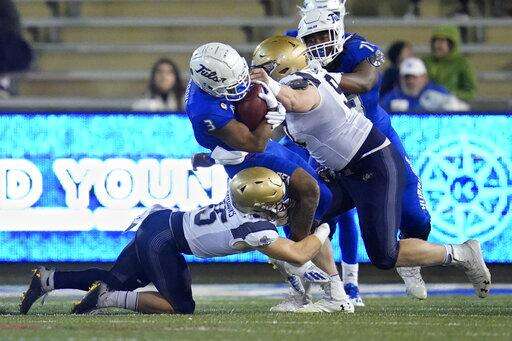 Tulsa running back Shamari Brooks (3) is hit by Navy defensive end Eavan Gibbons (15) and defensive lineman Clay Cromwell (97) in the first half of an NCAA college football game, Friday, Oct. 29, 2021, in Tulsa, Okla. (AP Photo/Sue Ogrocki)