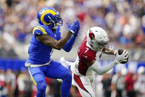 Arizona Cardinals cornerback Byron Murphy right, intercepts a pass intended for Los Angeles Rams wide receiver DeSean Jackson during the first half in an NFL football game Sunday, Oct. 3, 2021, in Inglewood, Calif. (AP Photo/Ashley Landis) The Associated Press