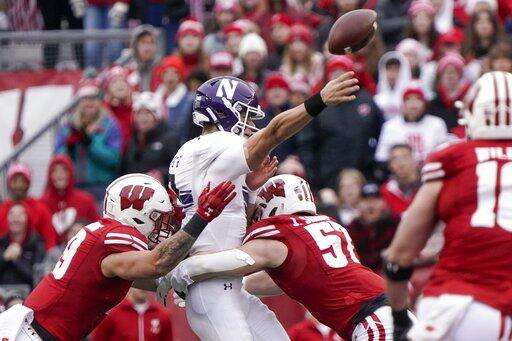 Northwestern quarterback Andrew Marty throws a pass as he's hit bt Wisconsin's Jack Sanborn and Nick Herbig during the first half of an NCAA college football game Saturday, Nov. 13, 2021, in Madison, Wis. (AP Photo/Morry Gash) The Associated Press