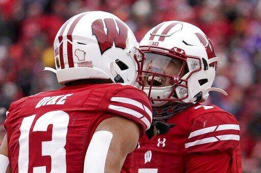 Wisconsin's Danny Davis III celebrates his touchdown catch with teammate Chimere Dike during the first half of an NCAA college football game Saturday, Nov. 13, 2021, in Madison, Wis. (AP Photo/Morry Gash) The Associated Press