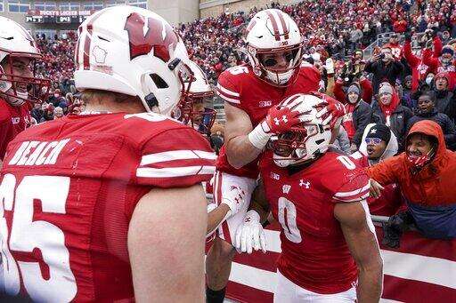 Wisconsin's Braelon Allen is congratulated by teammates after running for a touchdown during the second half of an NCAA college football game against Northwestern Saturday, Nov. 13, 2021, in Madison, Wis. (AP Photo/Morry Gash) The Associated Press