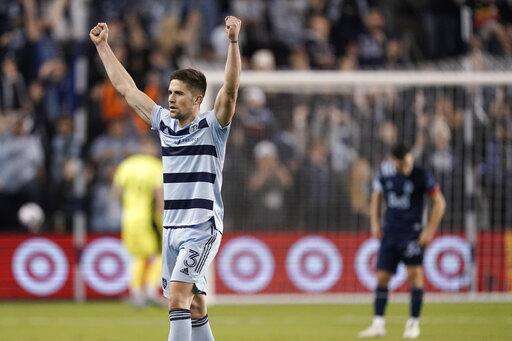 Sporting Kansas City defender Andreu Fontas celebrates after an MLS soccer match against the Vancouver Whitecaps, Saturday, Nov. 20, 2021, in Kansas City, Kan. Sporting KC won 3-1. (AP Photo/Charlie Riedel)