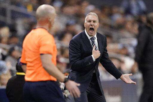 Sporting Kansas City coach Peter Vermes talks to an official during the second half of an MLS soccer match against the Vancouver Whitecaps, Saturday, Nov. 20, 2021, in Kansas City, Kan. Sporting KC won 3-1. (AP Photo/Charlie Riedel)
