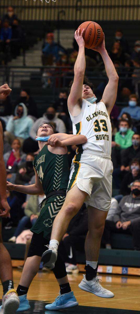 Glenbrook North's Brandon Gordon, right, grabs an offensive rebound next to St. Patrick's Brandon Adorno during the final of the Glenbrook North Thanksgiving tournament Saturday.