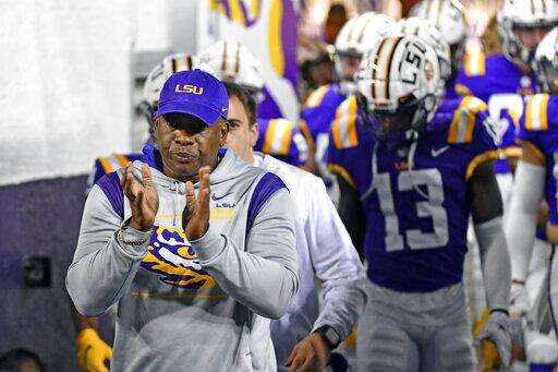 LSU wide receivers coach Mickey Joseph leads players onto the field before an NCAA college football game against Louisiana-Monroe, on Saturday, Nov. 20, 2021, at Tiger Stadium in Baton Rouge, La. Joseph, who coached wide receivers the last five seasons at LSU, will return to Nebraska as receivers coach, passing game coordinator and associate head coach under Scott Frost. (Hilary Scheinuk/The Advocate via AP) The Associated Press