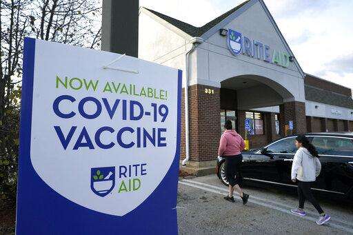 People walk past a COVID-19 vaccine sign as they enter a Rite Aid pharmacy, Tuesday, Dec. 7, 2021, in Nashua, N.H. Even as the U.S. reaches a COVID-19 milestone of roughly 200 million fully-vaccinated people, infections and hospitalizations are spiking, including in highly-vaccinated pockets of the country like New England. (AP Photo/Steven Senne)