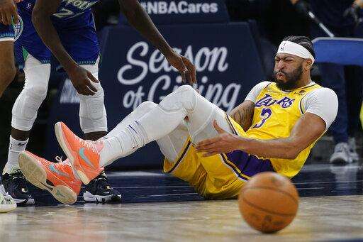 Los Angeles Lakers forward Anthony Davis (3) holds his leg after falling in the third quarter of an NBA basketball game with the Minnesota Timberwolves Friday, Dec. 17, 2021, in Minneapolis. The Timberwolves won 110-92. (AP Photo/Bruce Kluckhohn) The Associated Press