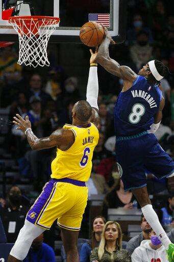 Minnesota Timberwolves forward Jarred Vanderbilt (8) blocks the shot of Los Angeles Lakers forward LeBron James (6) in the fourth quarter of an NBA basketball game Friday, Dec. 17, 2021, in Minneapolis. The Timberwolves won 110-92. (AP Photo/Bruce Kluckhohn) The Associated Press