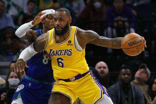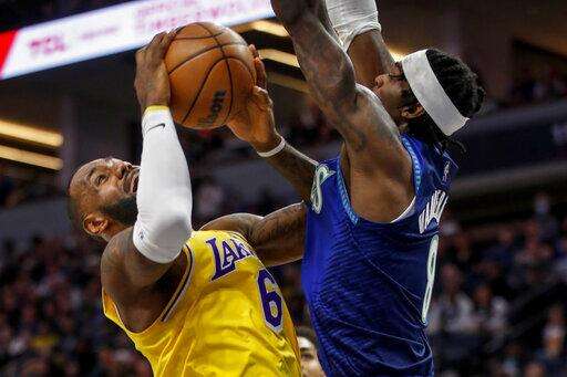 Los Angeles Lakers forward LeBron James (6) works to the basket around Minnesota Timberwolves forward Jarred Vanderbilt (8) in the third quarter of an NBA basketball game Friday, Dec. 17, 2021, in Minneapolis. The Timberwolves won 110-92. (AP Photo/Bruce Kluckhohn) The Associated Press