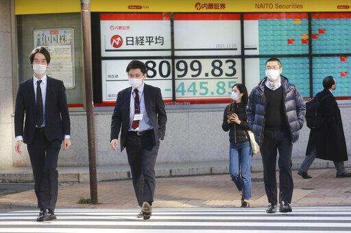 People walk by an electronic stock board of a securities firm in Tokyo, Monday, Dec. 20, 2021. Asian stock markets followed Wall Street lower on Monday amid concern about the coronavirus's latest variant and tighter Federal Reserve policy. (AP Photo/Koji Sasahara) The Associated Press