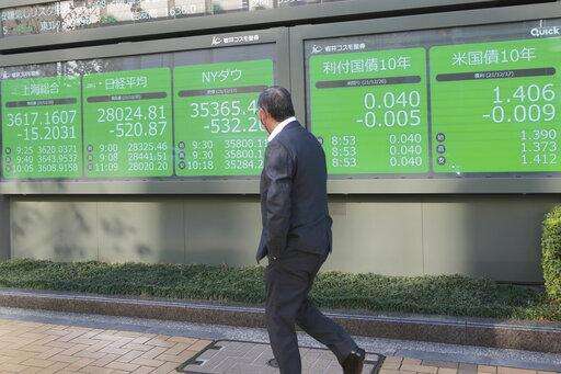 A man walks by an electronic stock board of a securities firm in Tokyo, Monday, Dec. 20, 2021. Asian stock markets followed Wall Street lower on Monday amid concern about the coronavirus's latest variant and tighter Federal Reserve policy. (AP Photo/Koji Sasahara) The Associated Press
