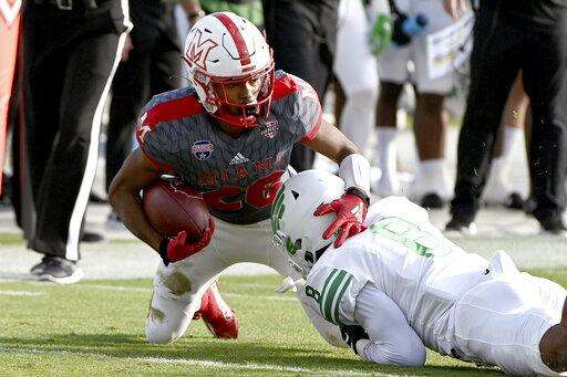 Miami (Ohio) defensive back Cecil Singleton (2) and defensive lineman Kameron Butler (82) tackle North Texas running back Ikaika Ragsdale (25) in the first half of the Frisco Football Classic NCAA college football game in Frisco, Texas, Thursday, Dec. 23, 2021. (AP Photo/Matt Strasen) The Associated Press