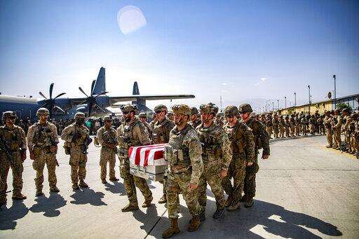 FILE - In this image provided by the U.S. Marine Corps, U.S. service members assigned to Joint Task Force-Crisis Response, are pallbearers on Friday, Aug. 27, 2021, for the service members killed in action during operations at Hamid Karzai International Airport in Kabul, Afghanistan, as transfer cases are placed onto a U.S. Air Force C17A Globemaster III for the flight back to the United States. (1st Lt. Mark Andries/U.S. Marine Corps via AP, File) The Associated Press