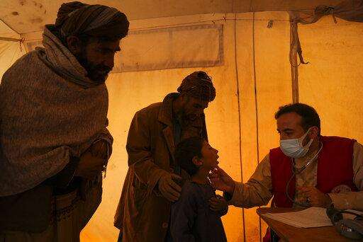 Medic examines sick boy in the makeshift clinic organised by IFRC in the IDP camp near Qala-e-Naw, Afghanistan, Tuesday, Dec. 14, 2021. Severe drought has dramatically worsened the already desperate situation in Afghanistan forcing thousands of people to flee their homes and live in extreme poverty. Experts predict climate change is making such events even more severe and frequent. (AP Photo/Mstyslav Chernov)
