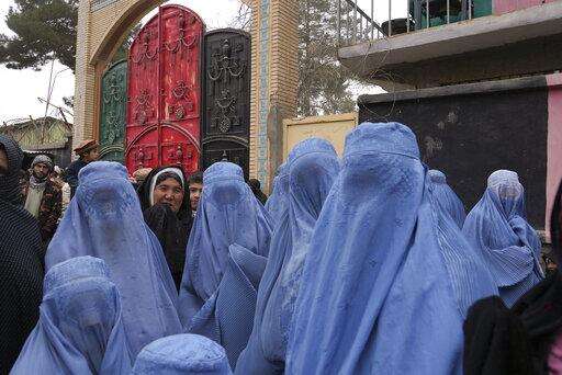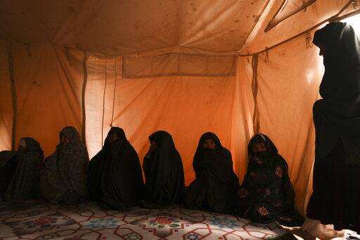 Afghan women gather in the makeshift clinic organised by IFRC in the IDP camp near Qala-e-Naw, Afghanistan, Tuesday, Dec. 14, 2021. Severe drought has dramatically worsened the already desperate situation in Afghanistan forcing thousands of people to flee their homes and live in extreme poverty. Experts predict climate change is making such events even more severe and frequent. (AP Photo/Mstyslav Chernov)