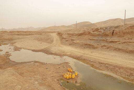 Oil canisters used to carry water stand in the middle of the riverbed of dried-out river, in Sang-e-Atash, Afghanistan, Monday, Dec. 13, 2021. Severe drought has dramatically worsened the already desperate situation in Afghanistan forcing thousands of people to flee their homes and live in extreme poverty. Experts predict climate change is making such events even more severe and frequent. (AP Photo/Mstyslav Chernov)