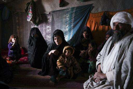 Gul Dasta and her family members gather in their house as they claim to have tried to sell Sallahuddin, one of the boys to get money for food in the IDP camp near Qala-e-Naw, Afghanistan, Tuesday, Dec. 14, 2021. Severe drought now gripping Afghanistan has dramatically worsened the already desperate situation in the country forcing thousands of people to flee their homes and live in extreme poverty. Experts predict climate change is making such events even more severe and frequent. (AP Photo/Mstyslav Chernov)