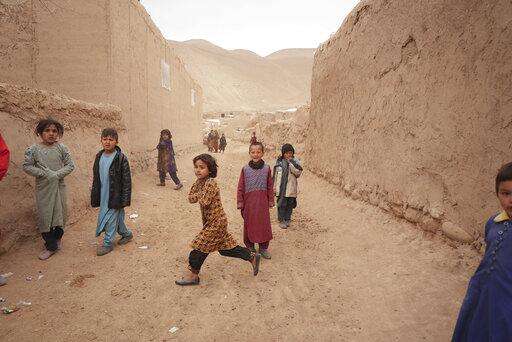 Afghan children pose for a photo as they play in street of Sang-e-Atash, Afghanistan, Monday, Dec. 13, 2021. The severe drought now gripping Afghanistan has dramatically worsened the already desperate situation in the country forcing thousands of people to flee their homes and live in extreme poverty. Experts predict climate change is making such events even more severe and frequent. (AP Photo/Mstyslav Chernov)