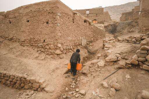 An Afghan boy carries canisters filled up with water in Balucha, Afghanistan, Monday, Dec. 13, 2021. Severe drought has dramatically worsened the already desperate situation in Afghanistan forcing thousands of people to flee their homes and live in extreme poverty. Experts predict climate change is making such events even more severe and frequent. (AP Photo/Mstyslav Chernov)