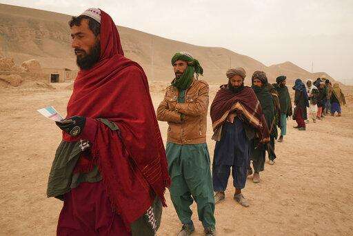 Afghan farmers suffering from consequences of the severe drought line up to receive food rations at a distribution point organised by the IFRC, in Sang-e-Atash, Afghanistan, Monday, Dec. 13, 2021. Severe drought has dramatically worsened the already desperate situation in Afghanistan forcing thousands of people to flee their homes and live in extreme poverty. Experts predict climate change is making such events even more severe and frequent. (AP Photo/Mstyslav Chernov)