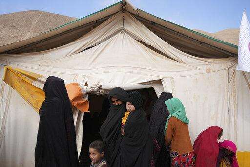 Afghan women and children leave the makeshift clinic organised by IFRC in the IDP camp near Qala-e-Naw, Afghanistan, Tuesday, Dec. 14, 2021. Severe drought has dramatically worsened the already desperate situation in Afghanistan forcing thousands of people to flee their homes and live in extreme poverty. Experts predict climate change is making such events even more severe and frequent. (AP Photo/Mstyslav Chernov)