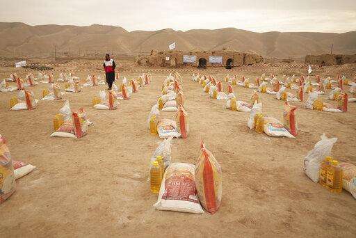 Member of IFRC stands among the food rations to be distributed to farmers, who are suffering from consequences of the drought, in Sang-e-Atash, Afghanistan, Monday, Dec. 13, 2021. Severe drought has dramatically worsened the already desperate situation in Afghanistan forcing thousands of people to flee their homes and live in extreme poverty. Experts predict climate change is making such events even more severe and frequent. (AP Photo/Mstyslav Chernov)