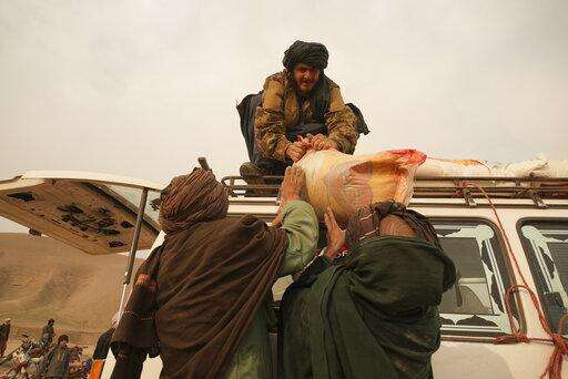 Afghan farmers suffering from consequences of the severe drought load food rations on the truck at the distribution point organised by the IFRC, in Sang-e-Atash, Afghanistan, Monday, Dec. 13, 2021. Severe drought has dramatically worsened the already desperate situation in Afghanistan forcing thousands of people to flee their homes and live in extreme poverty. Experts predict climate change is making such events even more severe and frequent. (AP Photo/Mstyslav Chernov)