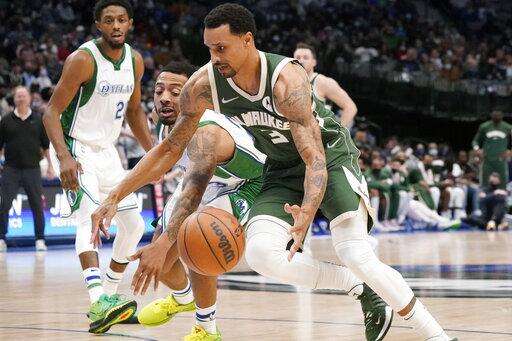 Milwaukee Bucks guard George Hill (3) and Dallas Mavericks guard Trey Burke (3) vie for control of the ball during the first half of an NBA basketball game in Dallas, Thursday, Dec. 23, 2021. (AP Photo/LM Otero) The Associated Press
