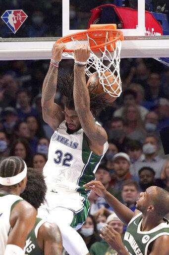 Dallas Mavericks forward Marquese Chriss (32) slam dunks during the first half of an NBA basketball game against the Milwaukee Bucks in Dallas, Thursday, Dec. 23, 2021. (AP Photo/LM Otero) The Associated Press