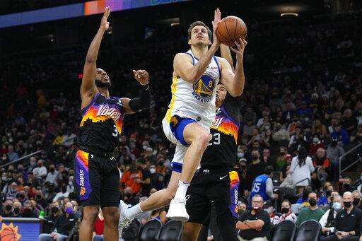 Warriors: Reserve G Moses Moody also was out in health and safety protocols. ... Draymond Green was called for a technical foul in the second quarter while arguing for a push-off by Booker. ... Curry has made a 3-pointer in 156 straight games, one off the NBA record he set from 2014-16. He's also made least two 3-pointers in 15 straight games, the longest active streak in the NBA with Phoenix's Cam Johnson.