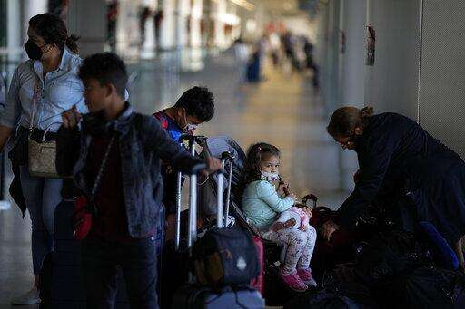 A family returning home to Panama after spending a three-week holiday in the U.S. arrives at Miami International Airport ahead of their flight, Monday, Dec. 27, 2021, in Miami. Thousands of flights worldwide were canceled or delayed on Monday, as airline staffing shortages due to the rapid spread of the omicron variant of COVID-19 continued to disrupt the busy holiday travel season. (AP Photo/Rebecca Blackwell)