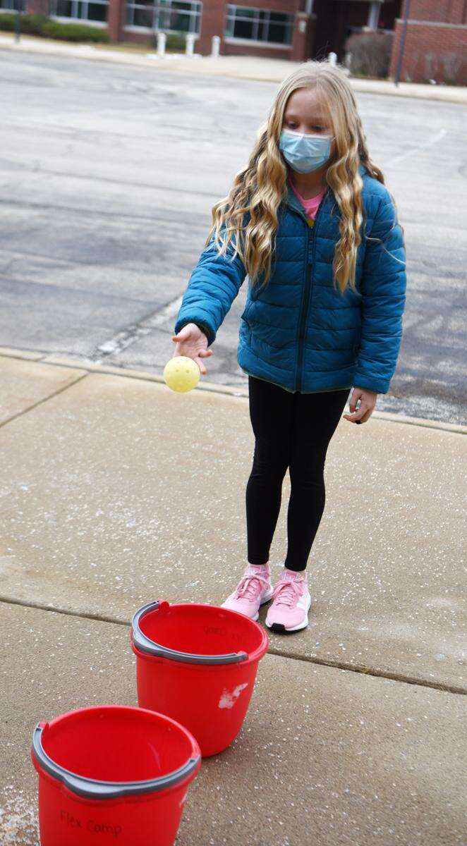 Makensie De Horn, 9, of Glenview tosses a ball into the buckets at Glenview Park Center, which was the first stop for the Glenview Park District's New Year's scavenger hunt.