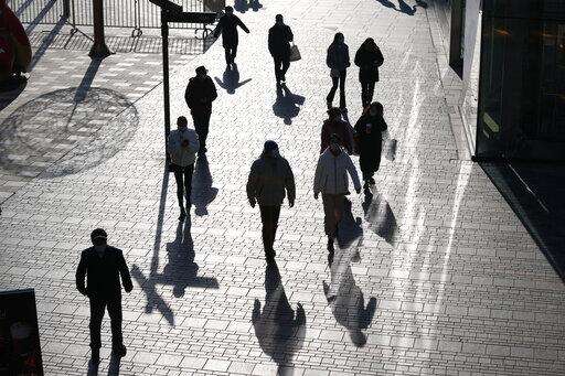 FILE - Visitors to a shopping mall cast shadows as they walk through a health check point in Beijing, China, on Dec. 14, 2021. Tianjin, a major Chinese port city near the capital Beijing, began mass testing of its 14 million residents on Sunday, Jan. 9, 2022, after a cluster of a dozen of children and adults tested positive for COVID-19, including a few with the omicron variant. (AP Photo/Ng Han Guan, File) The Associated Press