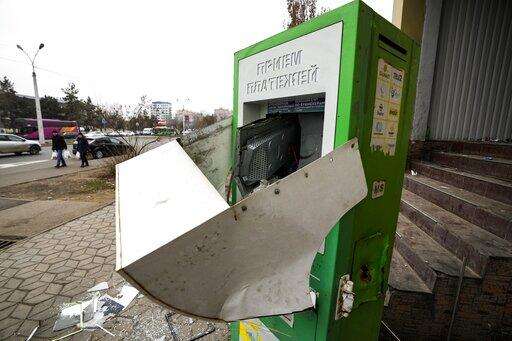 A broken services payment machine is seen on the street in Almaty, Kazakhstan, Tuesday, Jan. 11, 2022. Life in Almaty, which was affected with the violence the most during protests, started returning to normal this week, with public transport resuming operation and malls reopening. (AP Photo) The Associated Press