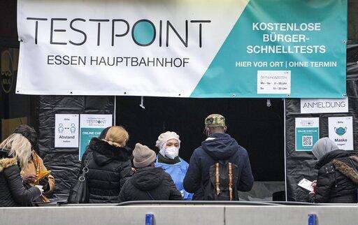 People wait to make a corona test in the city center of Essen, Germany, Wednesday, Jan. 12, 2021. Germany registered a new record of more than 80,000 new infections with the coronavirus on Wednesday. (AP Photo/Martin Meissner) The Associated Press